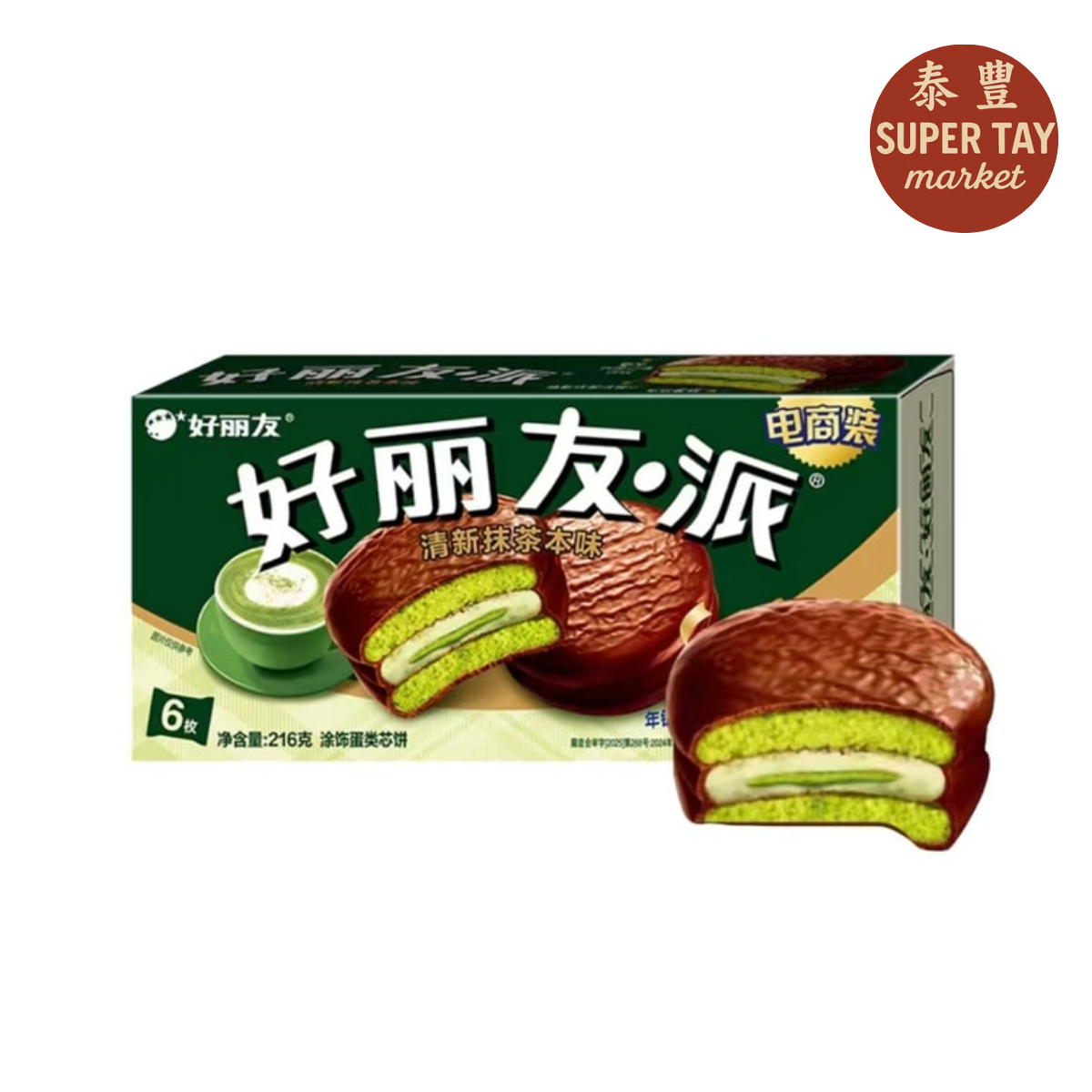 El queque de la marca Orion está relleno con crema sabor a té matcha. Su textura esponjosa y su sabor suave lo hacen ideal como snack o postre.